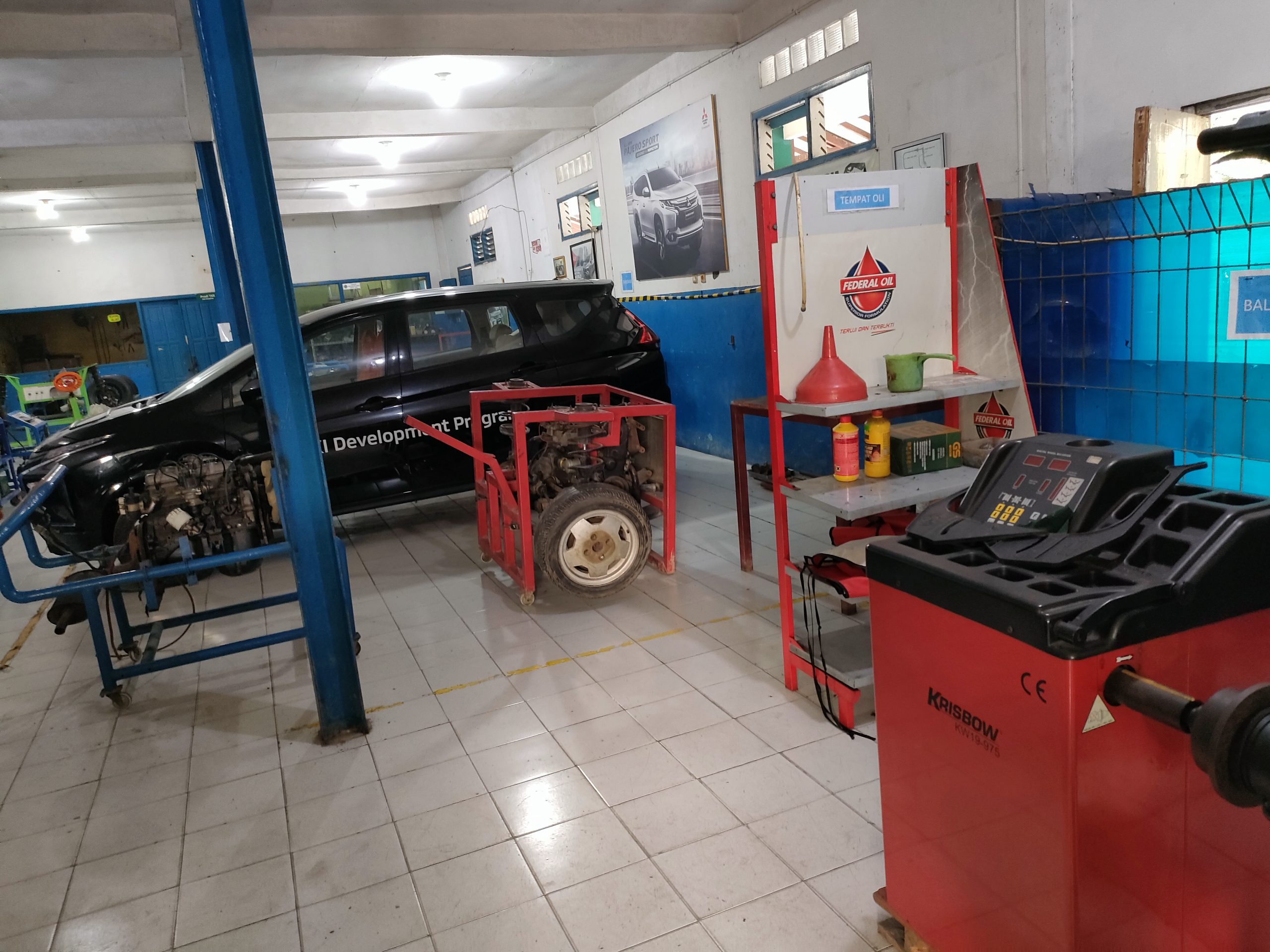インドネシアの職業訓練高校(SMK)は、自動車整備分野に特化した実習施設を備え、在学中からMITSUBISHI・HONDA・DAIHATSU・SUZUKIなど大手メーカーの認定工場でインターンシップを実施。